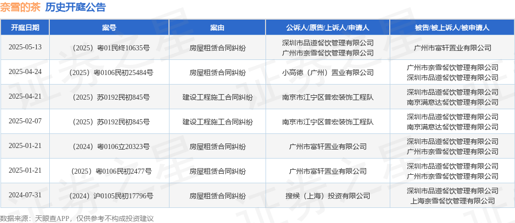 奈雪的茶作为原告/上诉人的1起涉及房屋租赁合同纠纷的诉讼将于2025年5月13日开庭